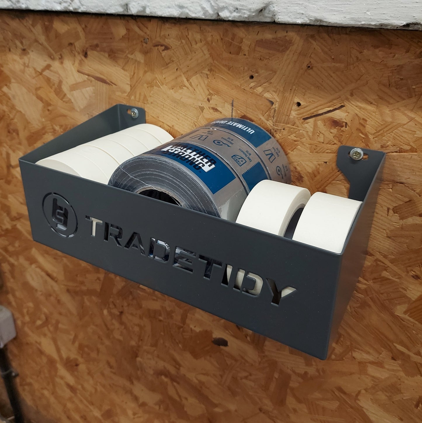 Tape in aGray Storage Tray Mounted on a Wooden Wall.