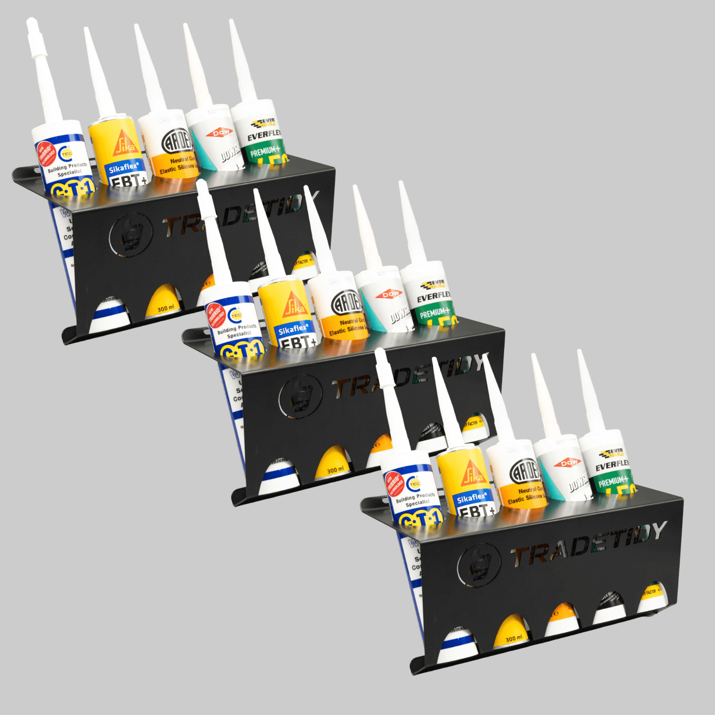 Silicone Tubes and Adhesive Tubes stacked in 3 Black Tube Holders by TradeTidy on a Gray Background